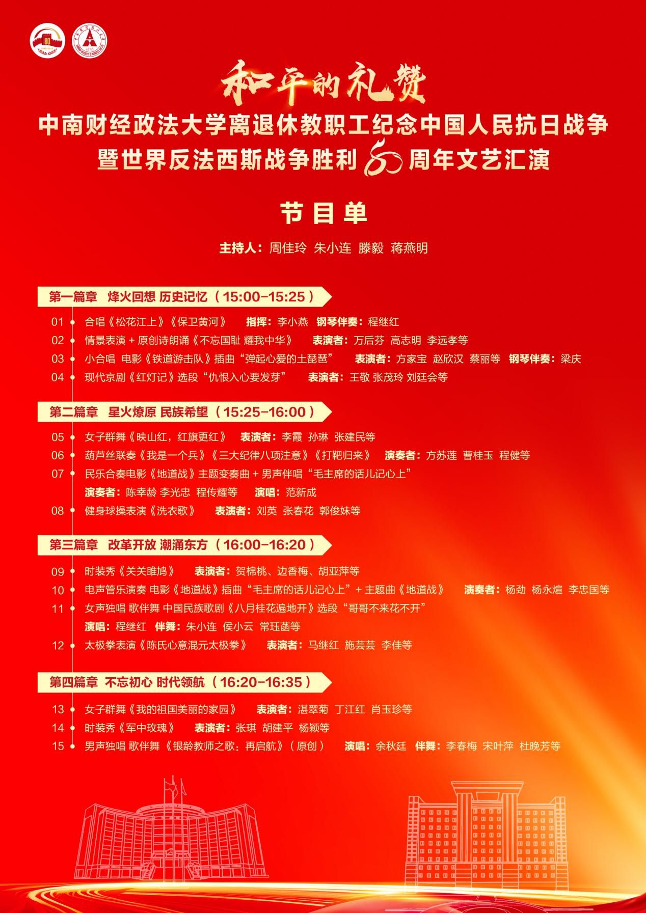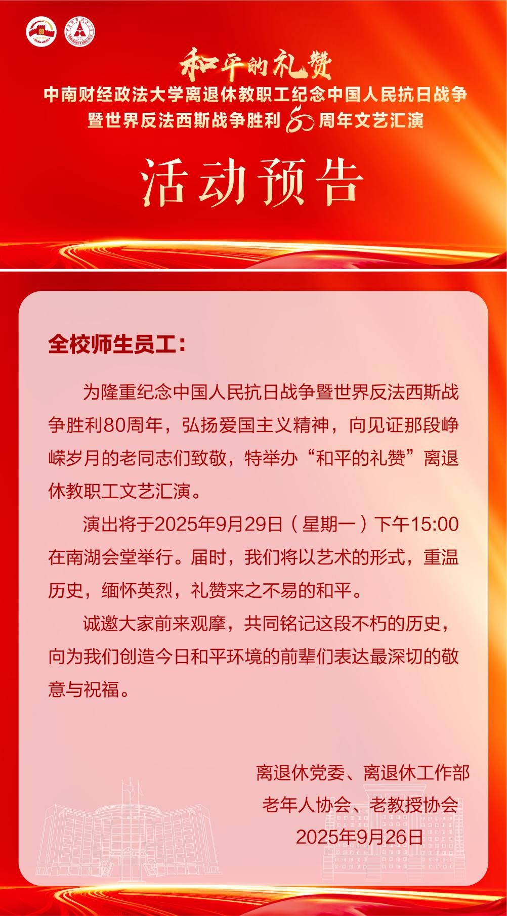 为隆重纪念中国人民抗日战争暨世界反法西斯战争胜利80周年,弘扬爱国主义精神,向见证那段峥嵘岁月的老同志们致敬,特举办“和平的礼赞”离退休教职工文艺汇演。